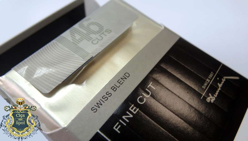 The back side of the pack still has the trademark “legend”, which explains why the series is called “Fine Cut”. And this design also mentions the blend of the branded pack consisting of Virginia and Orientals called “Swiss Blend”.