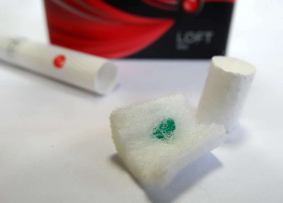 The filter of this variety is also three-sectional, but different. It consists of a section of acetate fiber with a generous saturation of carbon chips, a section of pure acetate fiber holding the capsule with flavoring and a cardboard mouthpiece, the so-called “air section”.