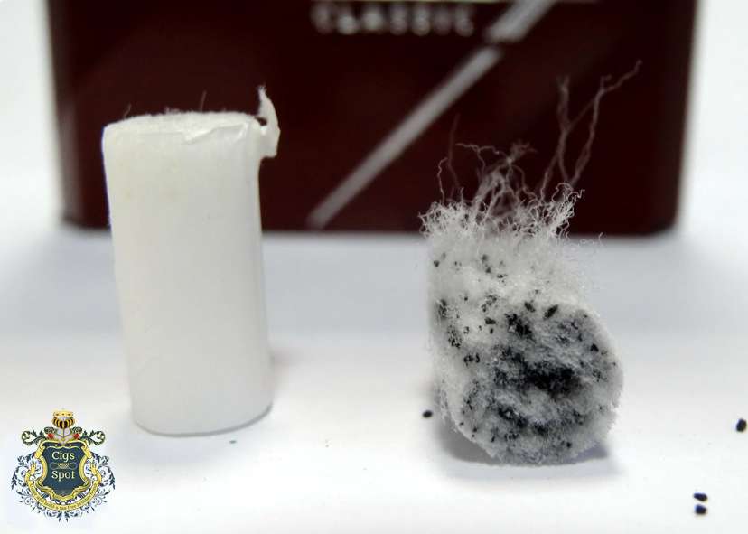 The cigarette has the usual two-part filter, common in many other brands. One section, larger, is made of pure acetate fiber, and the second, smaller, is made of fiber with a generous filling of charcoal crumbs.